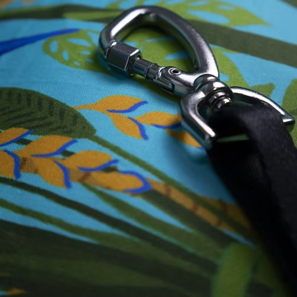 E para garantir ainda mais segurança durante os passeios ou viagens, a cama conta com mosquetão interno para prender à coleira do pet.