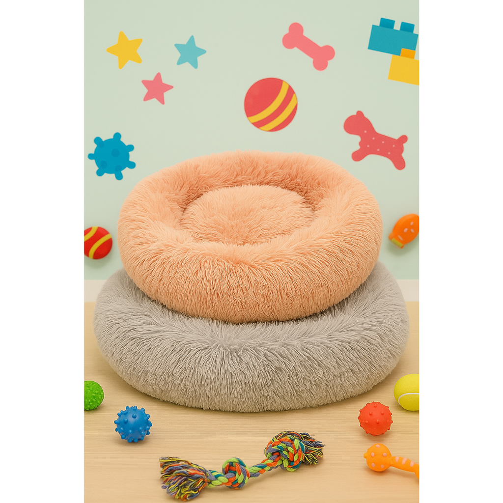 A foto mostra duas caminhas redondas de pelúcia empilhadas, uma na cor pêssego e outra na cor cinza, em um cenário alegre e lúdico. Ao fundo, a parede é decorada com adesivos coloridos de estrelas, ossinhos, bolinhas e peças de montar, criando um ambiente divertido e aconchegante. No chão, diversos brinquedos como bolinhas, mordedores e cordas completam o espaço, reforçando o clima de diversão e conforto para os pets.