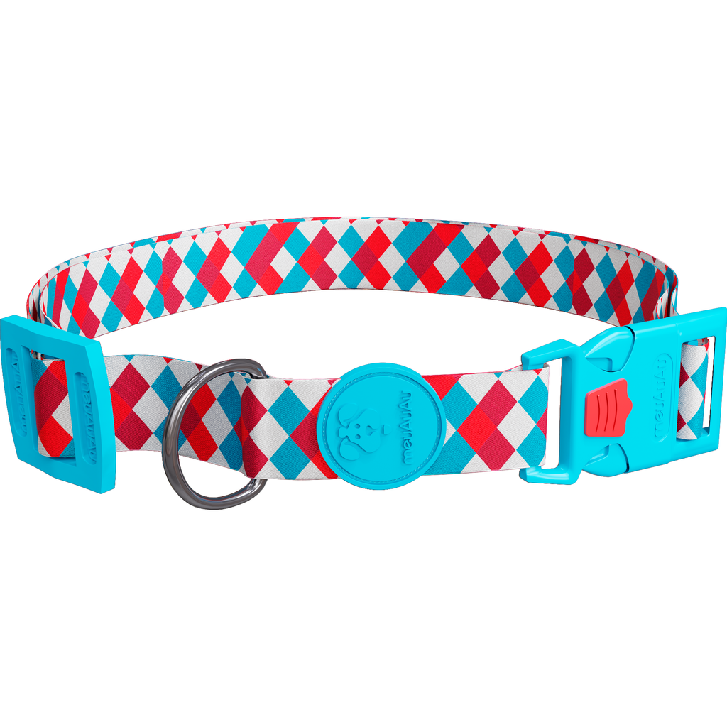 As coleiras da meuAuAu, feitas de fita de poliéster, são extremamente resistentes e duráveis. Com estampas de alta definição que não desbotam e logos de borracha atóxica, elas também oferecem segurança adicional com trava de segurança.