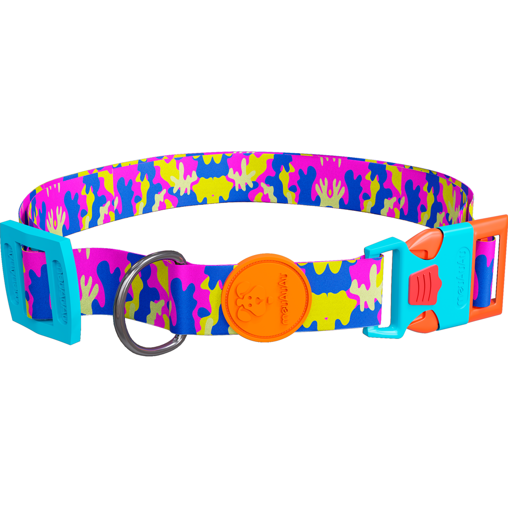 As coleiras da meuAuAu, feitas de fita de poliéster, são extremamente resistentes e duráveis. Com estampas de alta definição que não desbotam e logos de borracha atóxica, elas também oferecem segurança adicional com trava de segurança.