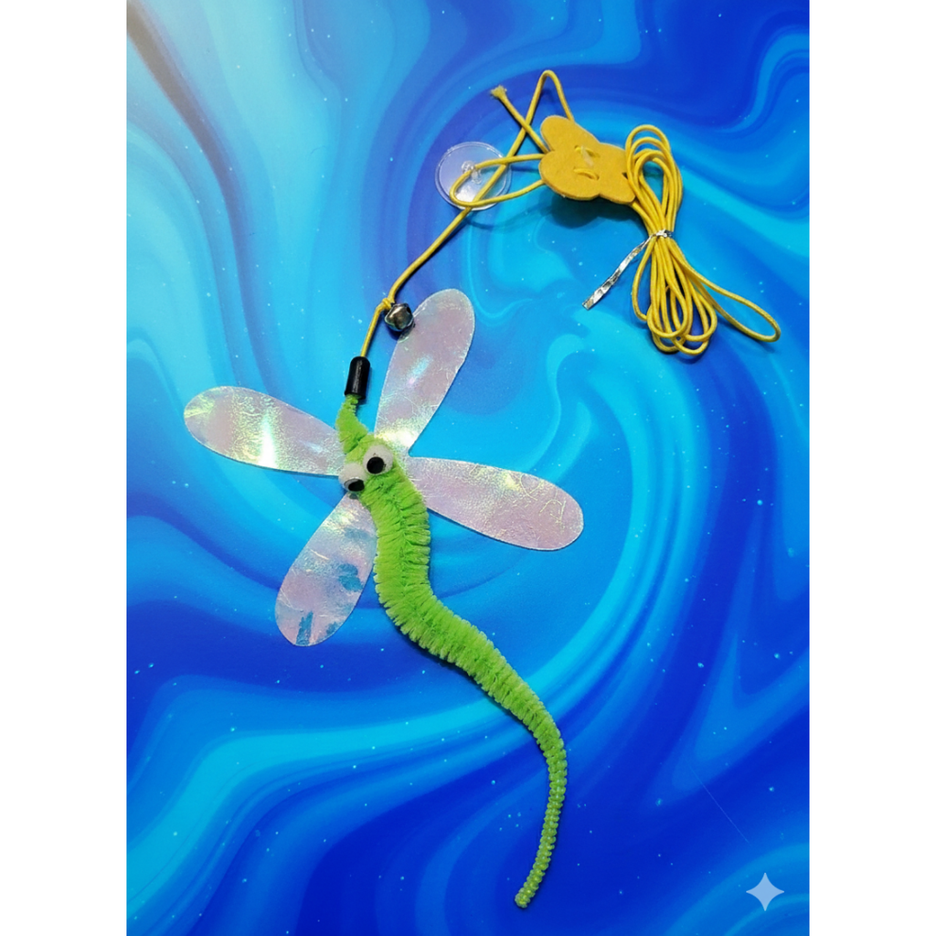 O objeto na imagem é um brinquedo interativo para gatos que se prende à maçaneta ou batente da porta. É um brinquedo de varinha tipo libélula que se pendura na porta.