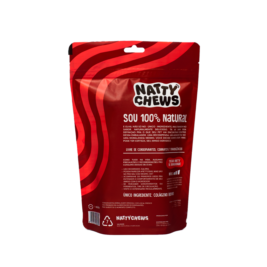 Os mordedores Natty Chews são 100% naturais e levam somente um ingrediente em sua composição. Não possuem aditivos, conservantes e corantes, sempre pensando no melhor para nossos pets.