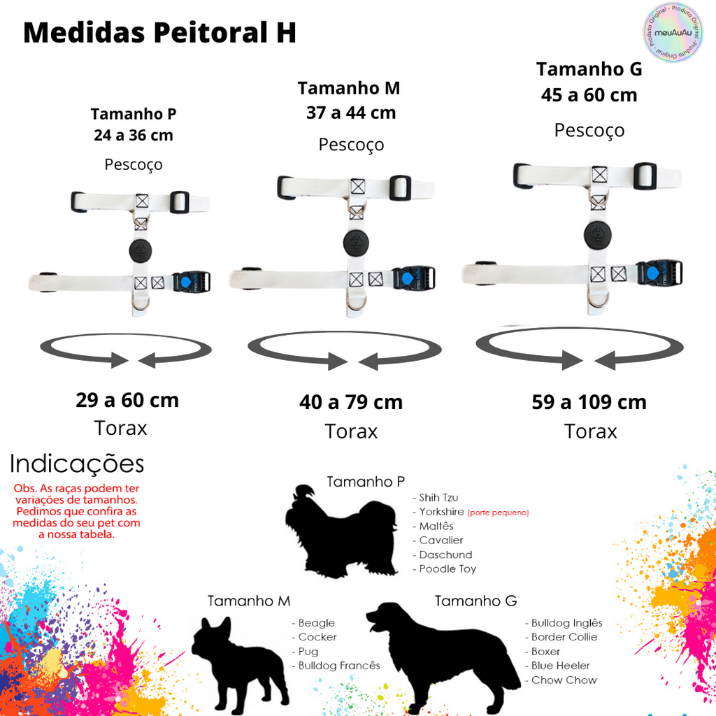 As estampas são em alta definição, não desbotam nem apagam com as lavagens. O peitoral é regulável no pescoço e na cintura, o que faz adaptar-se melhor ao tamanho do seu pet permitindo maior conforto durante os passeios.